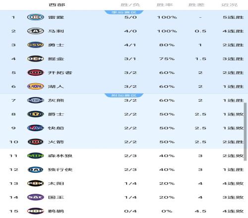 除了上面所说的2场比赛外,灰熊在莫兰特的率领下,以114:113准绝杀太阳,掘金则以122:88大胜鹈鹕,约基奇轻松拿到21+12+10的三双。此外,杜兰特状态回暖,砍下31分5篮板,帮助火箭以139:121大胜猛龙。下面是西部各球队具体排名,雷霆和马刺依旧保持不败金身,分别排名前二,勇士则4胜1负高居第3。