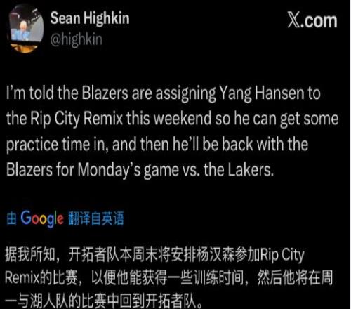 开拓者队记Sean Highkin解释了,开拓者就是为了让杨瀚森收获更多的训练时间,并且他将在周二与湖人的比赛中重回球队。