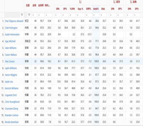 雷霆全队16人除了亚历山大三分受助攻率不足30%外,其余人都在60%以上,几位首发受助攻率更是飙到77%以上。从这一点可以看出,雷霆进攻真正有威胁的点只有亚历山大,其他人都是他的挂件帮他拉进攻空间。反观73胜勇士,库里只是一个相对有把握的得分终结点。汤普森、伊戈达拉甚至巴恩斯都能自主持球单打且每回合能拿到0.9分,虽然算不上精英持球攻击手但具备个人进攻威胁。而雷霆除了亚历山大其他人不仅没特别强持球进攻威胁,也没有足够强的单打欲望。这也是雷霆和73胜勇士进攻端最大差别。