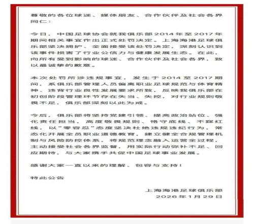 1月29日,上海市足球协会发文:今天上午,公安部、体育总局、中国足协联合召开足球行业“假赌黑”问题专项整治行动新闻发布会,对涉案者做出处罚通知。上海市足球协会坚决拥护所有相关决定,我们将在下阶段积极督促并协同上海申花和海港足球俱乐部理好旧账,接受处罚决定。同时引以为戒,在后续的训练比赛过程中,坚决杜绝违规违纪行为,积极践行体育精神。