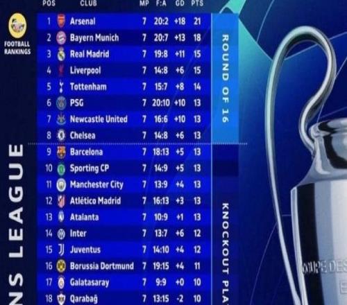 枪手拜仁提前晋级,欧冠末轮大乱战欧冠 01-22 07:55得益于赛制改革,欧冠联赛阶段第7轮战罢,从排名前8的头部争夺,到9-32名的中下游厮杀,悬念一直保持到最后一轮。目前只阿森纳和拜